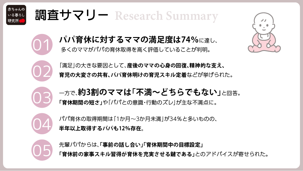 パパ育休を取得した家庭のママの74%が満足と回答。心強さを感じる一方で、期間の短さや意識のズレに不満の声も寄せられた。