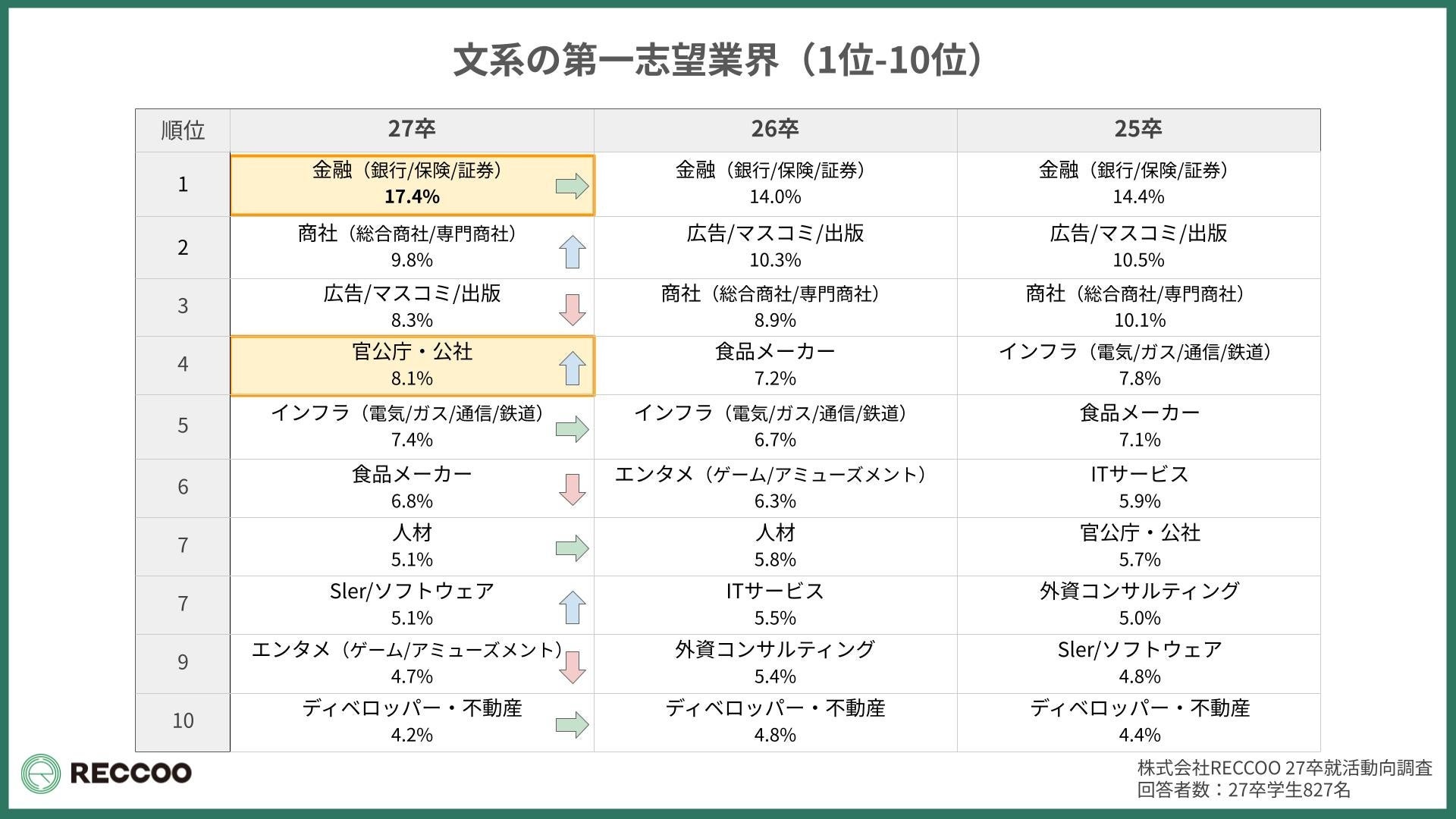 旧帝大・早慶ら800名調査で文系は官公庁が急浮上し4位に。理系は機械・電機と化学・素材メーカーが同率1位で人気集中。