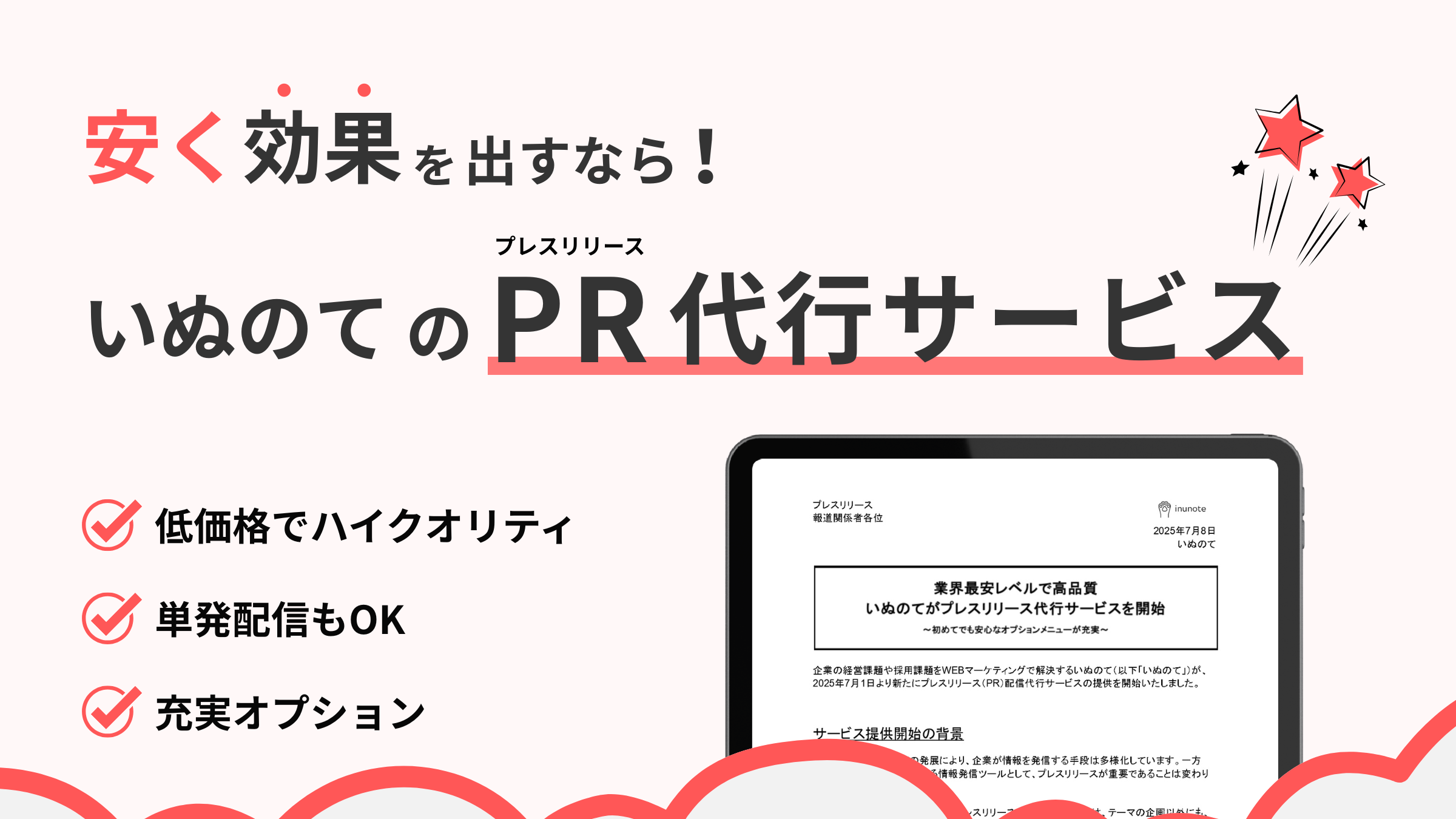 「プレスリリースを書きたいけど、何から手をつければいいかわからない」「書いてみたけど、メディアに取り上げてもらえるか自信がない」という方は、いぬのてのプレスリリース代行サービスにお気軽にご相談ください。ネタ出しから原稿作成・配信まで、貴社の広報活動をトータルでサポートします。